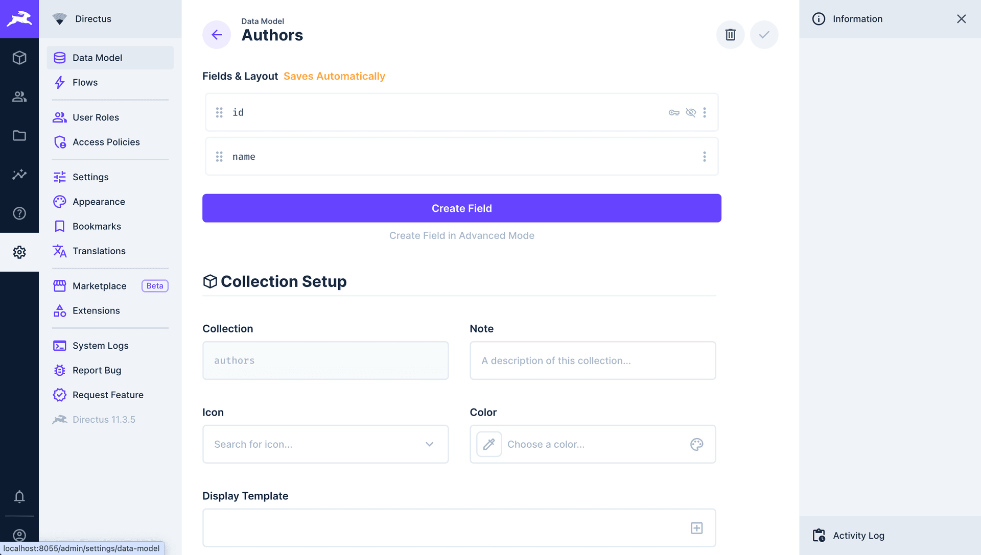 Configure the authors schema in Directus CMS